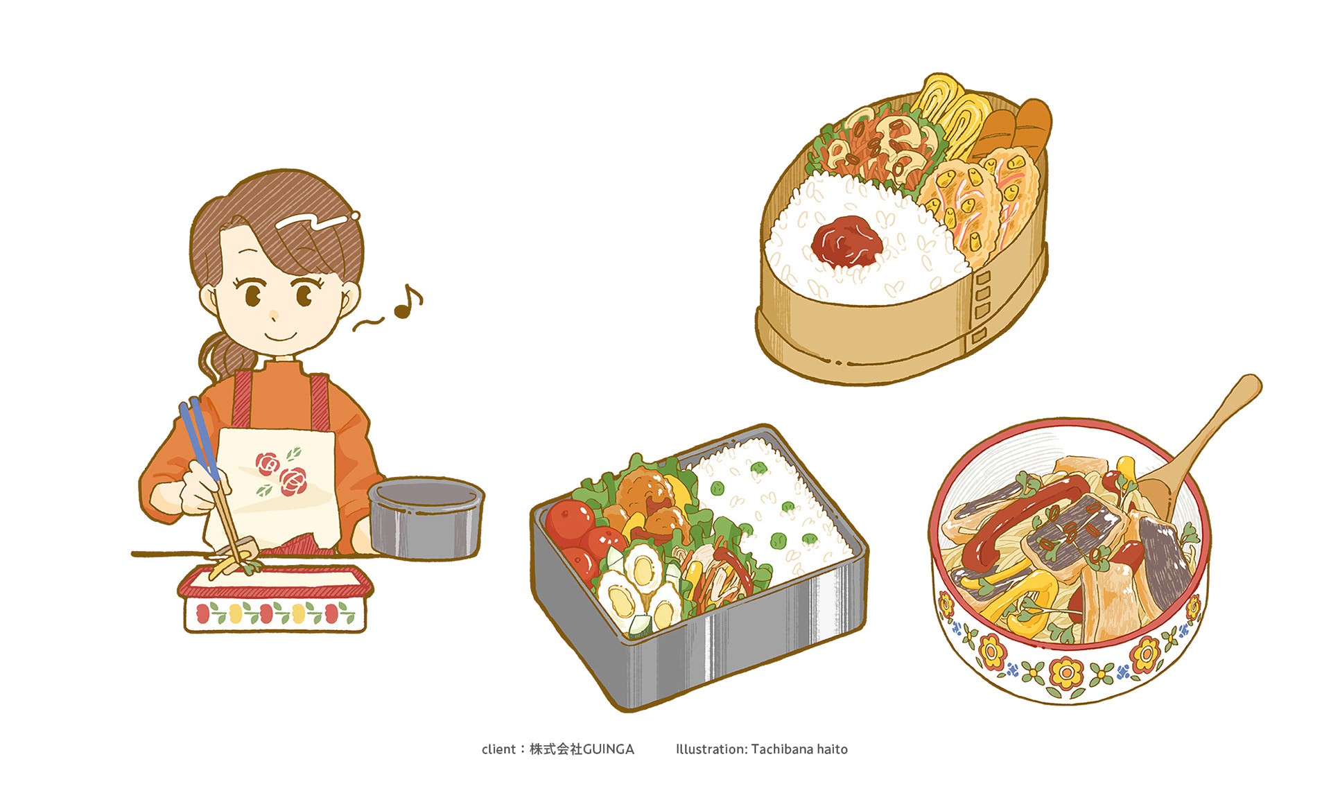 お弁当や常備菜など4点を、レトロ風タッチで制作させていただきました。