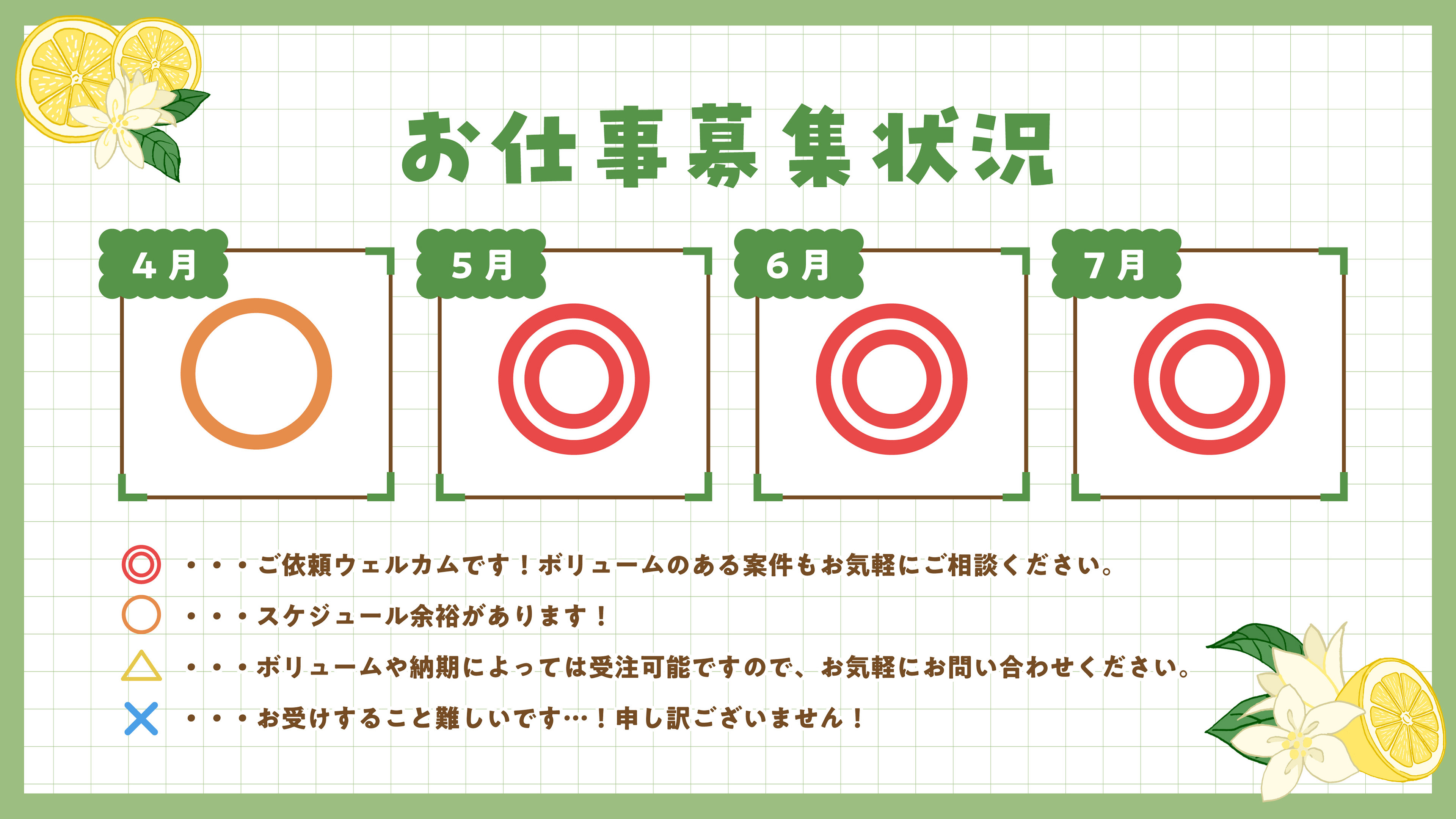 △、×になっている場合でも制作時期や内容によってはお受けできる場合もございますので、