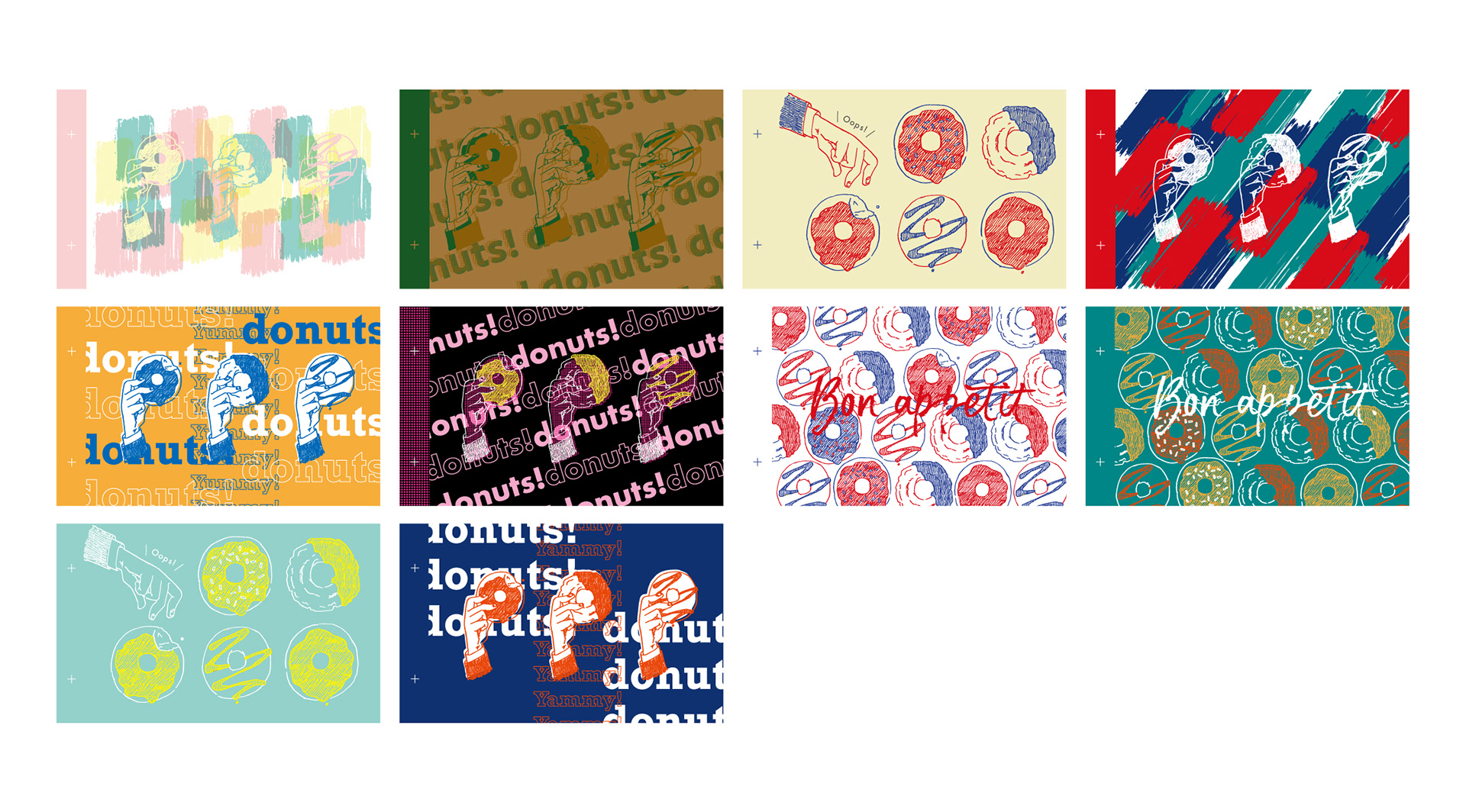 ドーナツをテーマに、制作したイラストを使ってグラフィカルなデザインを数パターン制作し、